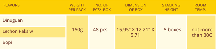 This pork dish is a rich combination of chopped pork meat with offal’s and vegetables cooked in cane vinegar, tomato catsup and premium spices. Turns your ordinary mealtime into a spicy, veritable fiesta!Product Specification