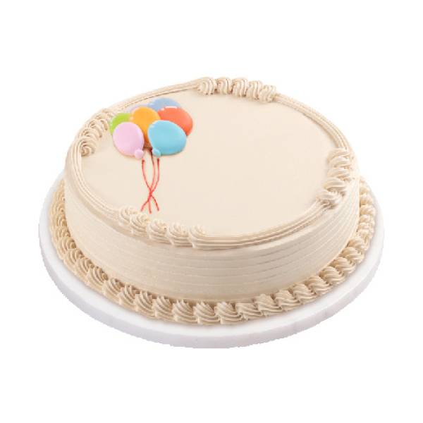 Mocha chiffon cake filled and iced with mocha buttercreme icing topped with colorful balloons.