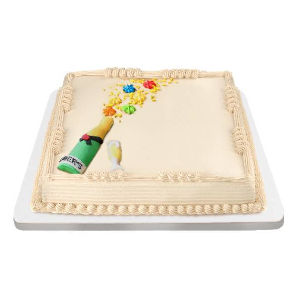 Light - brown colored mocha chiffon cake iced with mocha buttercréme icing. The sides of the cake are bordered with vanilla buttercréme icing topped with balloons toppers.