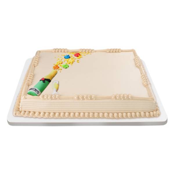 Light - brown colored mocha chiffon cake iced with mocha buttercréme icing. The sides of the cake are bordered with vanilla buttercréme icing topped with balloons toppers.