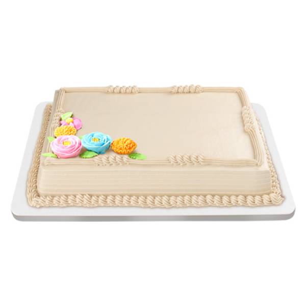 Light - brown colored mocha chiffon cake iced with mocha buttercréme icing. The sides of the cake are bordered with vanilla buttercréme icing.