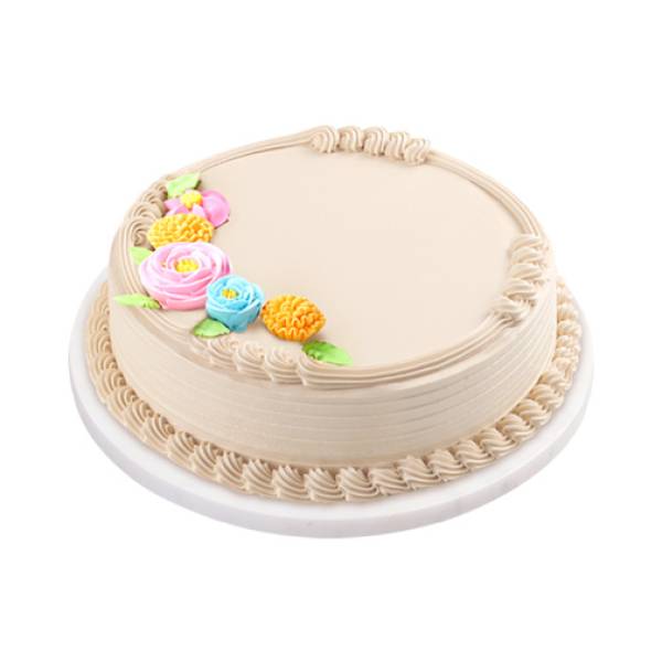 Light - brown colored mocha chiffon cake iced with mocha buttercréme icing. The sides of the cake are bordered with vanilla buttercréme icing topped with balloons toppers.