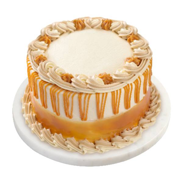 Our best-selling Luscious Caramel now in Petite size! Made with vanilla and mocha cake filled with vanilla buttercreme and caramel, iced with cream and drizzled with caramel sauce.