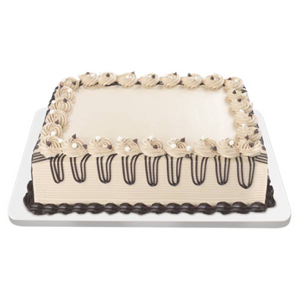 Delight in two layers of moist mocha and mocha marble chiffon, filled with luscious chocolate frosting. The cake is lavishly iced in smooth mocha buttercream, then drizzled with rich chocolate frosting that cascades down the sides. Topped with elegant mocha rosettes and sprinkled with chocolate chips.